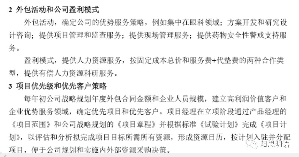 服务标准 一 SOP体系和相关文档的常见考虑 我们会和企业深度沟通,理解组织环境、业务、组织架构、人力资源成熟度,充分考虑到企业所在行业环境和适应症特点,透彻理解所受管辖的中国当局所有法规,并将主流药政国家的指南纳入参考之列以供企业长期发展用途。 首先,制定出政策Policy。例如,供应商筛选和管理政策,临床试验运营管理政策等。政策代表公司的总体期望,例如,寻找哪些身份的供应商,期望将运营管理水平提升和控制在何等水准。每提高质量一个维度,所需投入的成本倍增,因而保持切合实际的期望,对于企业发展来说比较靠谱和明智的。例如,项目管理政策,对预算、优先级、外包决策的考量等,有个基本的部门策略,确定基调,才能具体制定模板、表格、工具、流程、文档。 然后,开始制定相关SOP。主要是基于企业需做哪些类别的药物、哪些研究分期、哪些适应症、涉及哪些职责分工、外包哪些非核心职责、保留哪些核心职责,以此确定工作列表、研究可交付成果,再确定每个步骤,建立起SOP标准操作程序。 需考虑满足哪些指南和国内参考指导原则。例如,呼吸系统感染药物,和心血管药物的SOP就必然存在一些考虑上的区别。毕竟SOP事实上是岗位职责分工,组织架构设定后工作职能的发挥,寻找合适的内外部培训方案,确保岗位上的人员符合资质要求,并通过现场检查,确定公司的执行力和效率是否达到期望。一定要牢记,不要刚开始就设定不切实际的期望,量力而行,一点点不断改善,胜过好高骛远、信口胡扯,却从不执行。 再次,设定WI工作指引。如同前面所介绍,SOP本身并不能确保一个人的工作,良好的工作指引,有助于帮助包不同职责的员工按照书面协议开展分工有序的活动,最终形成整齐划一的集体行为。 最后,表格、工具模板。按照公司的实际情况,而非简单复制其它公司的模板、表格、手册、工具,形成公司具体环境的组织过程资产,最终可以有效指引员工开展工作。 二 SOP制定的实例介绍 应规定标题,内容的字体和字号。具体不赘述。 列明SOP的标题、编号、起草人,批准人,批准日期 I 目的:请介绍该SOP意图达到什么目标。 II 说明:对SOP做简短的说明,关键步骤。 III 适用群体:PM,CRA,医学,统计,等适用群体。 IV 术语定义:除单独起草一个术语集外,SOP一般应将里面提及的术语做出说明,例如PD,AE,SOP的目标和意义是期望读的人能深刻理解,这是唯一目标。 V 流程与步骤:讲解这些工作与活动,分别经由哪些分工角色,按照哪些步骤,有序推进,并设定清晰的描述。 VI 相关信息: 历史:包括发布日期和建立的原因,修改的日期和原因,审核的过程和关键改动,修订历史陈列 相关文档 可将所有和这个SOP有关的附件,其它SOP,陈列于此,便于整合浏览。 例如,最重要的两个SOP,自然是研究中心管理和项目管理,陈列出所有相关文档,有助于员工按照其职责分工明确,并有效开展行动。 三 什么是政策 政策是组织对战略目标实现的策略,以书面、具体的形式描述出来。 例如,某CRO的战略,是成为中国在肿瘤、心血管领域最有影响力的CRO公司。 围绕这个战略,你想实现,就必须确保公司的核心业务是具备给肿瘤领域、心血管领域研发能力最强的企业提供临床试验核的医药产品研发专业服务和综合性解决方案。 沿着这个思路,你开始拟定公司的政策。 肿瘤,实体瘤,还是血液肿瘤?生物药,还是小分子实体?创新药还是仿制药?沿着这个思路,你的团队架构才能出来,比如I期/BE团队、IV期团队、II-III期团队。 每个公司的架构设计是不同的。因为,你的成本负担和盈利业务单元是什么?围绕谁为核心来设计作战单元?这就是制药企业喜欢治疗领域为Team,但也有些喜欢以华南、华北、华东等地理位置的Team分类,这都是根据运营总监结合公司战略目标来进行选择的,没有一个架构是放之四海而皆准的。 Policy对于跨国巨头,他们会切割的非常细致,例如,知情同意、受试者数据处理、研究可交付成果等,拿出来做单独的Policy。 但对于本土CRO,我们管理没有这么细致,也没有这么狭隘,我们通常是紧密衔接和其它业务支持部门共同确保整个CRO运行,或者初创企业没有NDA品种时全部依赖于我们III期运作,我们这阶段的架构设计和政策清晰就很重要。 所以照抄照搬Policy没有任何意义,只有深刻理解组织运行、环境、人力资源成熟度、核心竞争力,才能把Policy落实到位,形成SOP和所在体系。 例如,我们运营管理的基本政策描述。 通过这样的描述,公司逐步形成设想,我们提供什么服务?我们哪些合作模式? 我们才能对我们的客户弄清楚,他们有哪些业务活动需要外包,例如研究设计、方案开发、CRF搭建。 通过这样的摸索,我们就能理解客户的未被满足的需求比如成为强生下一年度的两家Vendor其一,或者让未被释放的需求让它释放出来,比如裁掉罗氏的监查团队,交给昆泰和泰格分别做III期和IV期; 如果没有政策描述,很多东西就无法具体到SOP中。 例如,项目经理控制预算不得超支10%这个政策,你写完这个大政策、大目标后,需要跟进落实的。例如,申办方要求将二三线城市比例30%提升到50%,导致的超支,怎么算?CRO面临这种情况,如果是固定成本总价合同,他不同意;如果是服务费+PTH,他拼死推荐;这绝对不是一个外包合同能讲清楚的,需要有这些文档予以约束。 四 什么是视野、远见、格局 A类人才需要的视